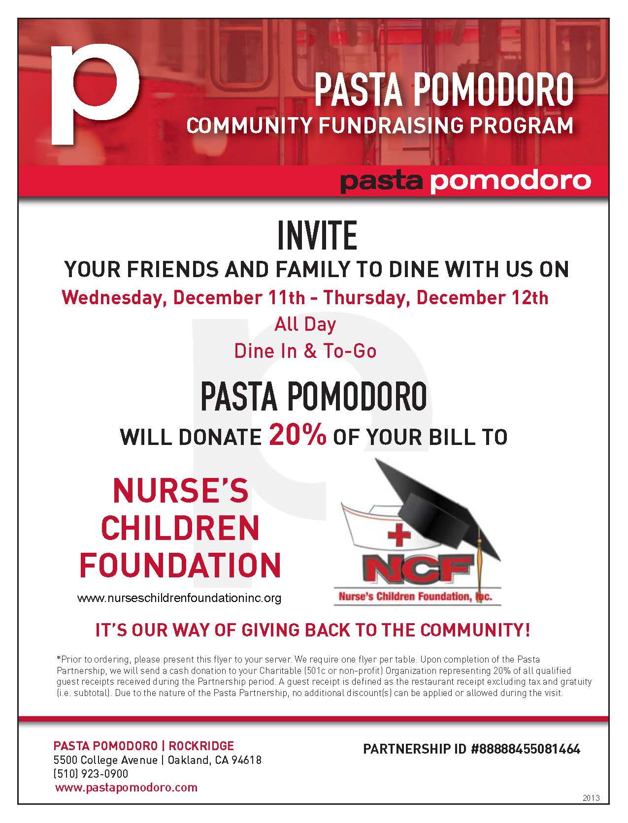 NCF Fundraiser at Pasta Pomodoro December 11 & 12 All Day!